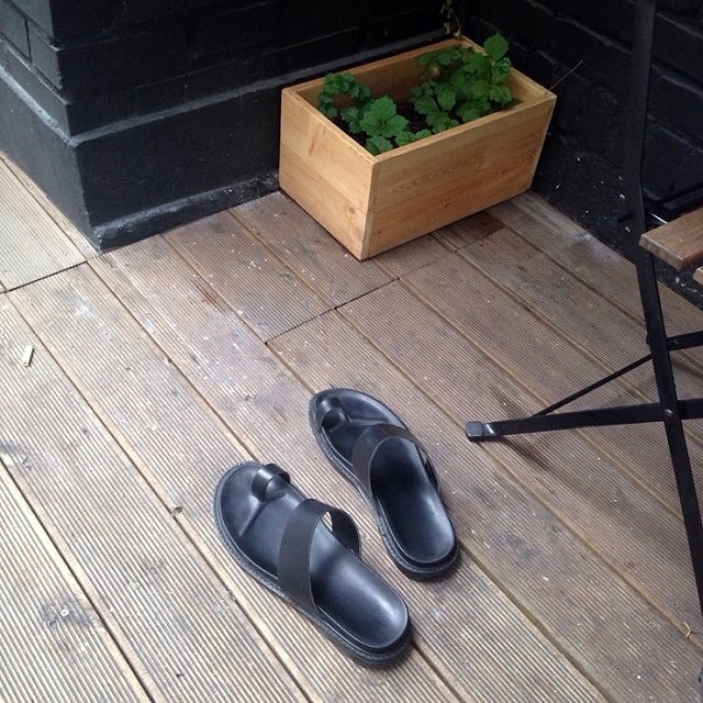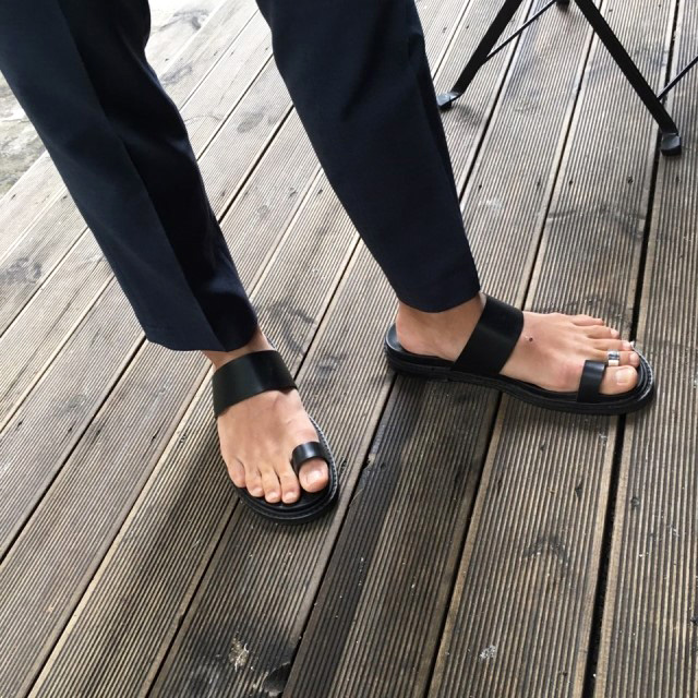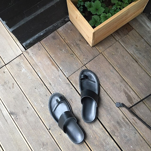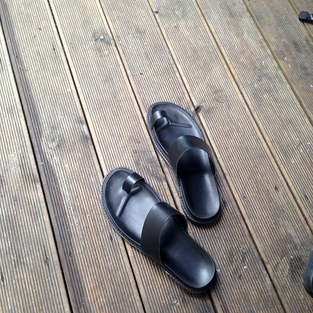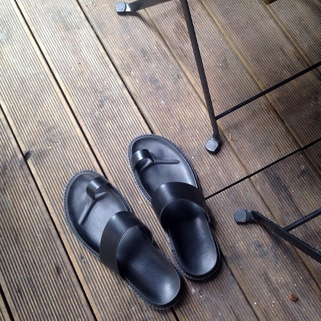 리얼 레더(가죽)의 고급스러움과 블랙 컬러의 심플함, 엄지 포인트의 디자인까지 3박자를 고루 갖춘 수제화 슬리퍼입니다.