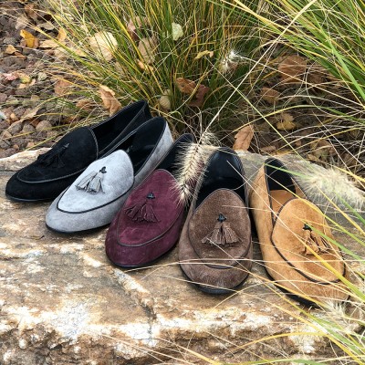 테슬로퍼는 네이밍 그대로 테슬(방울 디테일)을 매듭으로 묶어놓은 디자인을 일컫습니다. 벨지안 스웨이드 테슬로퍼는 바디 전체에 띠가 둘러진 포맷으로 안정된 느낌도 더했습니다.